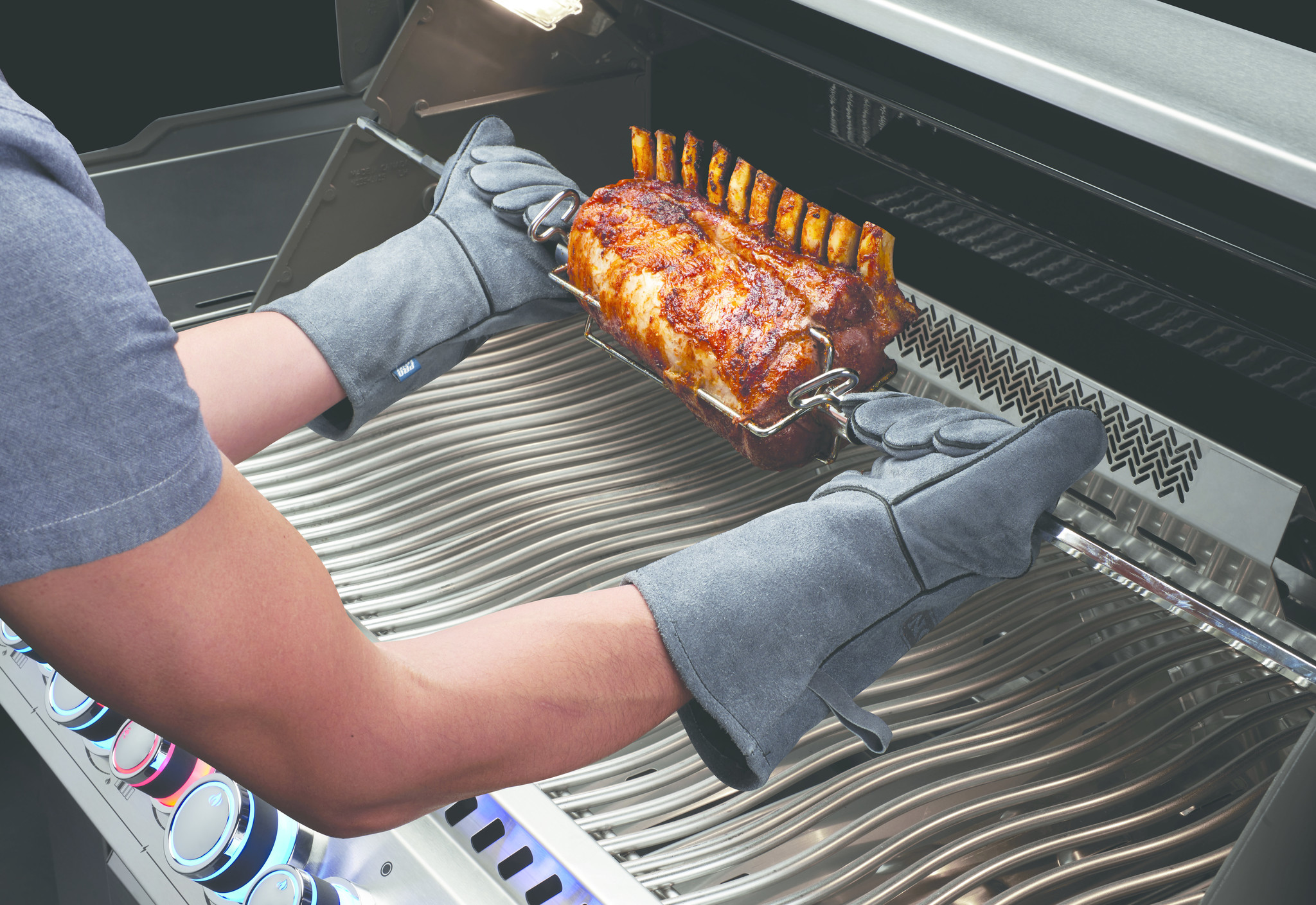 De grijze BBQ-handschoen, van runderleer, beschermt de gebruiker tegen hitte tijdens het grillen dankzij de versterkte stiksels en een goede pasvorm met uitstekende bewegingsvrijheid.